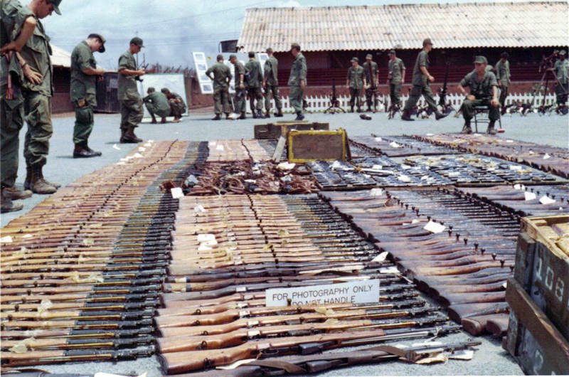The men pictured here are former Viet Cong. Under the Chieu Hoi program, they abandoned the Communist side and were outfitted to fight for the government in Saigon. (1970)