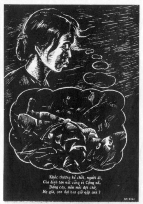 Leaflet # SP-2141 depicts a mother crying over the image of her dead son, killed while fighting. The leaflet is designed to encourage enemy soldiers to rally to the government side before being killed in battle. PSYOP records indicate that 15 million copies of this leaflet were prepared in December 1967 and forwarded to Da Nang, Nha Trang, Pleiku, Bien Hoa, and Can Tho. The text on the front of the leaflet is: