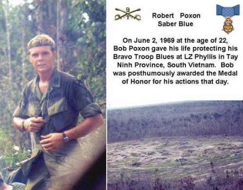 For conspicuous gallantry and intrepidity in action at the risk of his life above and beyond the call of duty. 1LT Poxon, Armor, Troop B, distinguished himself while serving as a platoon leader on a reconnaissance mission. Landing by helicopter in an area suspected of being occupied by the enemy, the platoon came under intense fire from enemy soldiers in concealed positions and fortifications around the landing zone. A soldier fell, hit by the first burst of fire. 1LT Poxon dashed to his aid, drawing the majority of the enemy fire as he crossed 20 meters of open ground. The fallen soldier was beyond help and 1LT Poxon was seriously and painfully wounded. 1LT Poxon, with indomitable courage, refused medical aid and evacuation and turned his attention to seizing the initiative from the enemy. With sure instinct he marked a central enemy bunker as the key to success. Quickly instructing his men to concentrate their fire on the bunker, and in spite of his wound, 1LT Poxon crawled toward the bunker, readied a hand grenade and charged. He was hit again but continued his assault. After succeeding in silencing the enemy guns in the bunker he was struck once again by enemy fire and fell, mortally wounded. 1LT Poxon’s comrades followed their leader, pressed the attack and drove the enemy from their positions. 1LT Poxon’s gallantry, indomitable will, and courage are in keeping with the highest traditions of the military service and reflect great credit upon himself, his unit, and the U.S. Army.