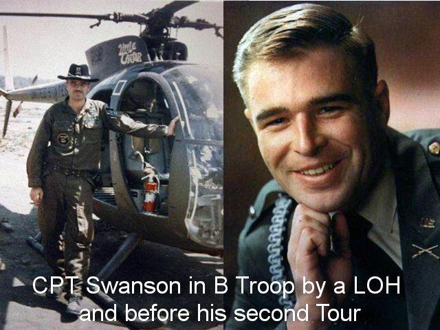 Walker Jones‘ Saber Article May/June 2000: Dear Troopers and Family, We have great news! Our close family just got larger. And we all have recently, by proxy, received a huge dose of pride to boot. I had the distinct honor (and luck) to be present on 1 May at the White House Rose Garden when President BUSH presented the Medal of Honor (posthumously) to the wife and daughters of CPT Jon Edward SWANSON (B Trp, ’70-71). CPT SWANSON and his gunner/observer, SSG Larry G. HARRISON were killed on Feb. 26, 1971 when their OH-6A (“Loach”) was shot down in Cambodia. The 1-9th Cambodia incursion in ’71 supported “Task Force 333” concurrently with the infamous “Lam Son 719” in Laos – I presume we were there to keep the NVA in Cambodia occupied; well, they kept us quite occupied, as any Trooper from those days can attest! These two men’s remains were only recently located and identified. The mission to award Jon with the MOH was apparently quite independent, but coincidental, with the finding and identification of his and HARRISON’s remains, which were indistinguishable and thus were buried together on 3 May. CPT SWANSON was B Trp’s Scout Plt Ldr (Sabre White) while HARRISON was the Scout Plt Sgt (White Mike); the top Scout leadership in the Troop died together. CPT Jon E. SWANSON I was already in D.C. on business that week and had earlier received a heads-up from Al DeFLERON of the Bullwhip Squadron Assn about the MOH plans and Arlington interment. After a mad series of cell phone exchanges, I met up with 3 other former 1-9th pilots (Vietnam) to witness the President’s presentation of the MOH in the Rose Garden on May 1. At the White House gates, I joined Jack SHIELDS (B Trp XO, CO, ’70-71), and James “Jim” KURTZ (A, C Trp Cobra pilot, ’70-71, 5235 Nottinghill Lane, Fairfax, VA 22032 ), then met Jack MORRISSEY (A Trp pilot, ’68 ). Jim KURTZ pulled some strings to get us in at the last minute, but due to the short notice, “the word” couldn’t get out in time to get others “vetted” by White House staff. Mike SLONIKER , Vietnam Helicopter Pilots’ Assn (VHPA) Historian, with lots of Pentagon and Arlington experience, and who is a champion of Vietnam helicopter crews, told me that this lack of notice is typical. Too bad, as I believe many dozens would have made the trip. Amy COLEMAN with the Office of Administrative Assistant to the Secretary of the Army did a wonderful job of herding us around to the multitude of additional events. A photo of the presentation is at . Jon’s wife, Sandee SWANSON, and their beautiful daughters, Holly Christine WALKER and Brigid Eileen Swanson-JONES seemed to be knocked out to find us there among the crowd of dignitaries and families, us sporting our Stetsons. They were hungry to know what type of war their hero husband/dad had fought and sacrificed. I’m sure each of us felt like me – so surprised and so honored just to be there and be so … welcomed. That was not what I was expecting. Jack SHIELDS, Jon’s XO at the time he was killed, had traveled from Arkansas, and found himself the only person present who had been there that day in 1971 and knew Jon when he was killed (both had also served their first tours together with D/3-5 Cav, 9th Inf Div). Jack was inundated with questions. Jack also attended Thursday’s activities with Jon’s family, which included CPT SWANSON’s induction into the Hall of Heros at the Pentagon: see . He also kept telling me that B Trp’s CO, MAJ LOTT – who put Jon in for the MOH – should be sharing in this tremendous event, but he couldn’t be located in time. It was a perfect spring day in the Rose Garden. Dogwoods and azaleas in full bloom (I left s. Texas at 100 degrees). Jon would have been 60 years old on this day. About 60 of Jon SWANSON’s family were present and I think we must have been introduced to all of them – they are all such wonderful people. This family was already “together” before they ever gathered for this event. Great family – now OUR family, or rather we are now THEIR family. There were also lots of heavy duty dignitaries present, including Army Chief of Staff GEN SHINSECKI who is also a Vietnam Vet – rare among General Officers these days – and SGT Major of the Army (SMA) Jack TILLEY (both pictured with Sandee SWANSON at the website above). Nick BACON, president of the Medal of Honor Society, was there along with 3 three other MOH winners. They are fine folks, as one would expect. I should mention that the MOH ceremony was for two men – CPT (Dr.) Ben L. SALOMON was honored for his bravery on Saipan in WW2. Sadly, no living relatives could be located, but several of his college classmates and their families made it their business to attend. SALOMAN’s classmate and champion, Dr. Robert WEST, accepted the MOH from President BUSH. The MOH citation for CPT Jon E. SWANSON states: “On February 26, 1971, Captain Jon E. SWANSON was flying an OH-6A aircraft on a close support reconnaissance mission in support of Army of the Republic of Vietnam (ARVN) Task Force 333 in the Kingdom of Cambodia. Two well equipped enemy regiments were known to be in the area, and Captain SWANSON’s mission was to pinpoint precise enemy positions. To accomplish this mission, he was required to fly at treetop level at a slow airspeed, thus making his aircraft a very vulnerable target. The advancing ARVN unit came under heavy automatic weapons fire from the enemy bunkers in a treeline approximately 100 meters to their front. Captain SWANSON, completely exposing himself to enemy anti-aircraft fire, immediately engaged the enemy bunkers with SSG HARRISON’s concussion grenades and machine gun fire.” “After the crew destroyed five bunkers and successfully evaded ground-to-air fire, Swanson, he discovered a .51 caliber machine gun position. He had expended his heavy ordnance on the bunkers and did not have sufficient explosives to destroy the positions. Consequently, he 