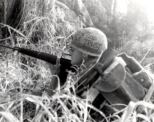 During Operation Ashburn, south of Da Nang in Decmber 1967, a member of the 5th Marine Regiment scans the jungle for signs of enemy activity (Sgt. Dickman/Marine Corps/National Archives).