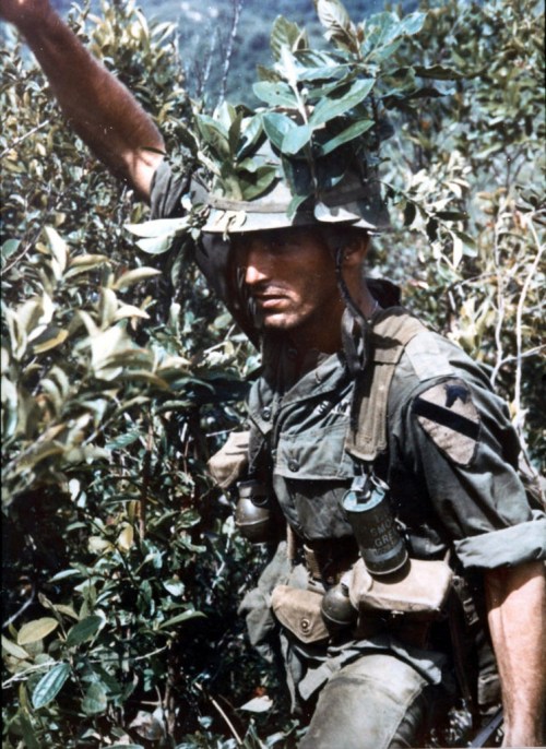 A squadron leader’s camouflaged helmet helps him blend in with his surroundings during a mission in 1966 (U.S. Army/National Archives).